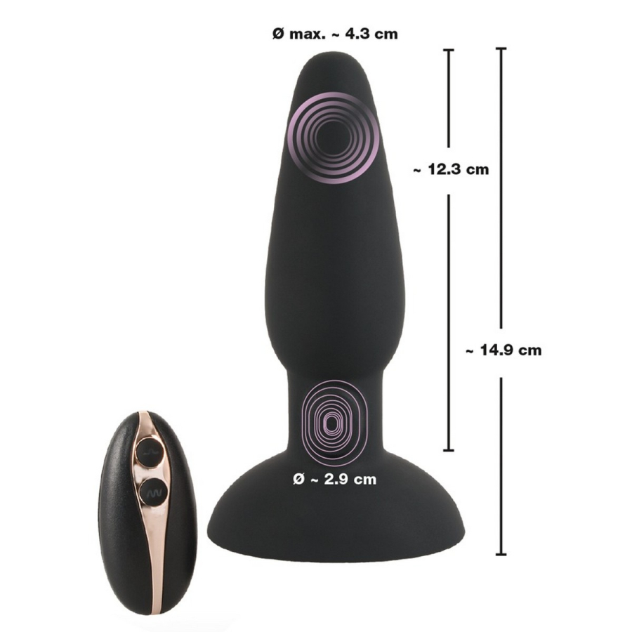 Виброанальная пробка с инновационной функцией "удара" в нижней части для интенсивной стимуляции анального входа. С помощью беспроводного пульта дистанционного управления можно отдельно управлять 7 вибрационными режимами и 3 режимами пульсирующего постукивания - удобно одним нажатием кнопки. С радиусом действия до 10 метров даже от партнера - для удивительных моментов удовольствия и захватывающих контрольных игр. Покрытый мягкой текстурой на ощупь, он обеспечивает очень приятное ощущение кожи, когда его носят и с ним играют. Широкое основание обеспечивает безопасное использование без проскальзывания. Поскольку он водонепроницаем, его также можно использовать в душе или в ванной. Перезаряжаемый - включает в себя USB кабель для зарядки и аккумулятор (CR2032) для пульта дистанционного управления.