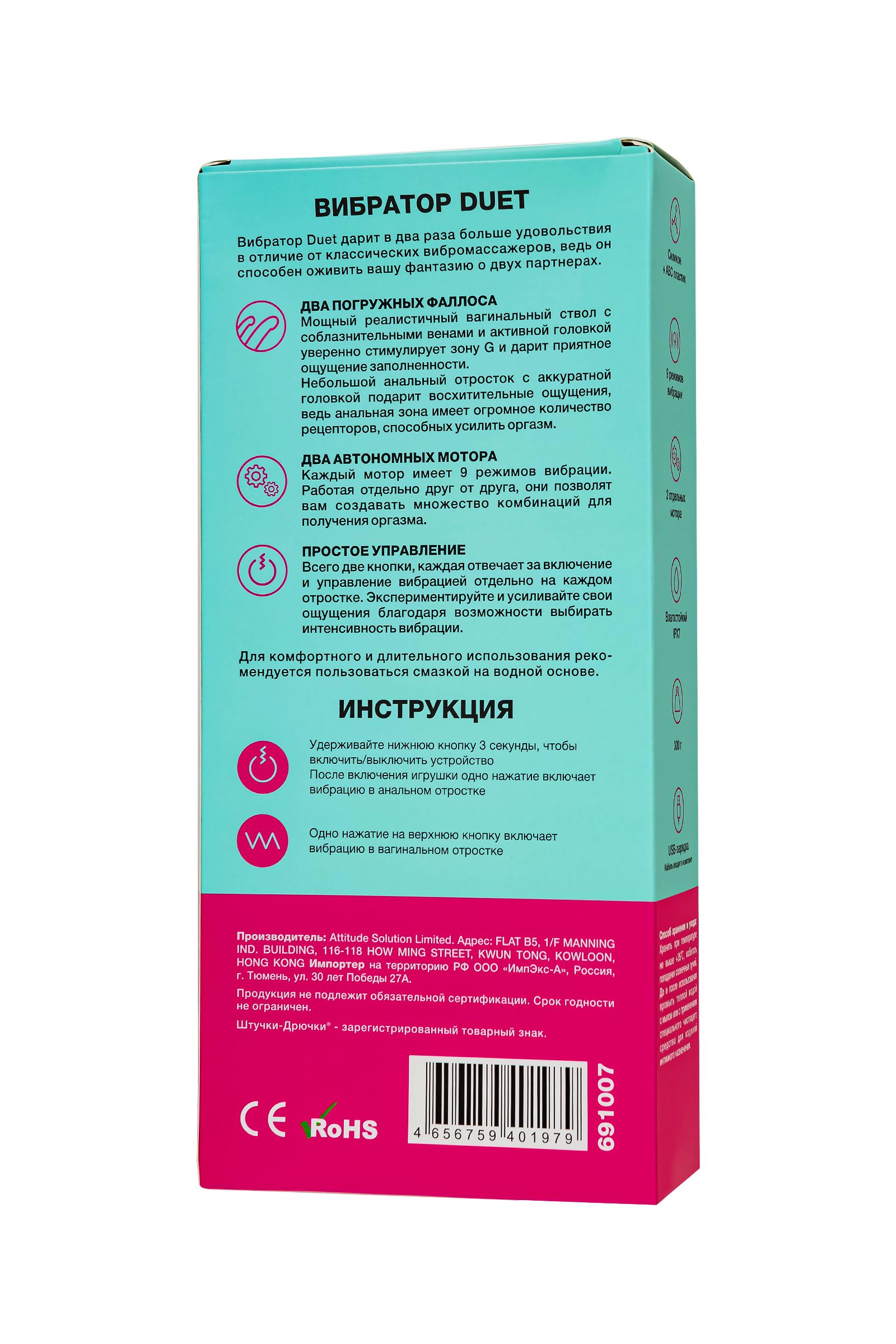 Два автономных мотора. Вибрация делает проникновение наиболее пикантным, воздействуя на эрогенные зоны. Ощутите, как волны наслаждения накатывают, приближая самый неистовый оргазм. По 9 режимов вибрации в каждом стволе работают отдельно друг от друга, позволяя вам создавать множество комбинаций по своему желанию.