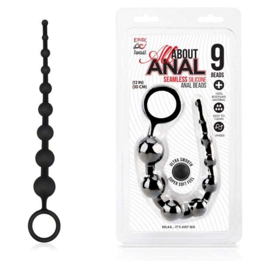 Готовы вывести свою анальную игру на новый уровень? Наши силиконовые анальные бусы All About Anal подарят вам в девять раз больше острых ощущений! С бусинами разного размера, выполненными из гладкого силикона, вы получите удовольствие от каждого рывка! Так что не сиди просто так - приходи и присоединяйся к анальной вечеринке! Черные ультрабархатистые и нежные силиконовые бусы, состоящих из 9 шариков, диаметром от 0,8 см до 3 см, общая длина цепочки с кольцом для извлечения 30 см. После использования промойте игрушку под струей теплой воды с мылом, затем высушите ее и уберите на хранение в темное место, не допуская попадания прямых солнечных лучей.