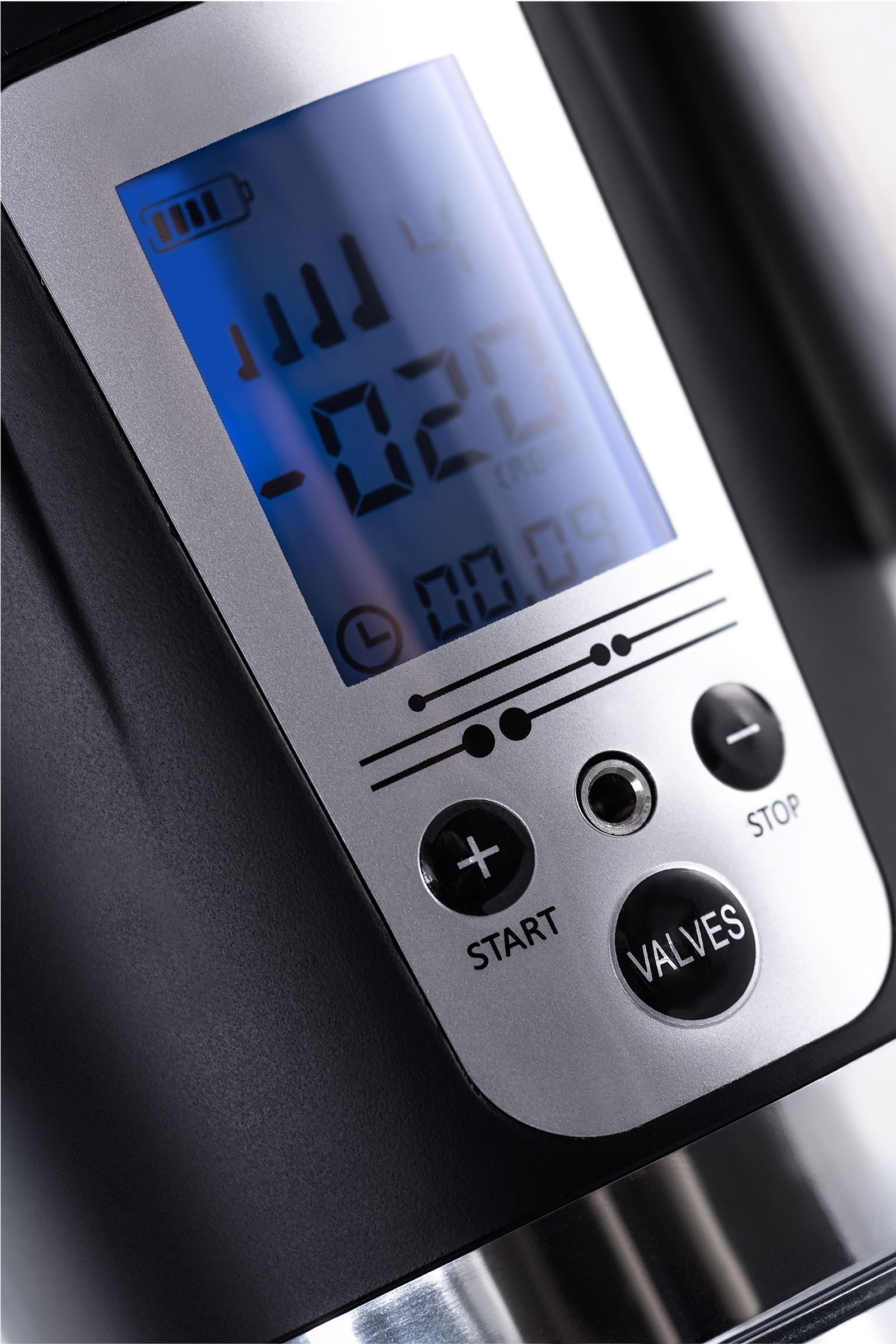 Повышение уровней: коротким нажатием на кнопку «+» последовательно повышайте уровни откачки воздуха. На экране в режиме реального времени отображается давление в колбе в Mbar. Помпа останавливается на заданном уровне и поддерживает указанный индикатором уровень давления. Если вы сбросите давление кнопкой «VALVES», помпа автоматически откачает воздух до заданного уровня.