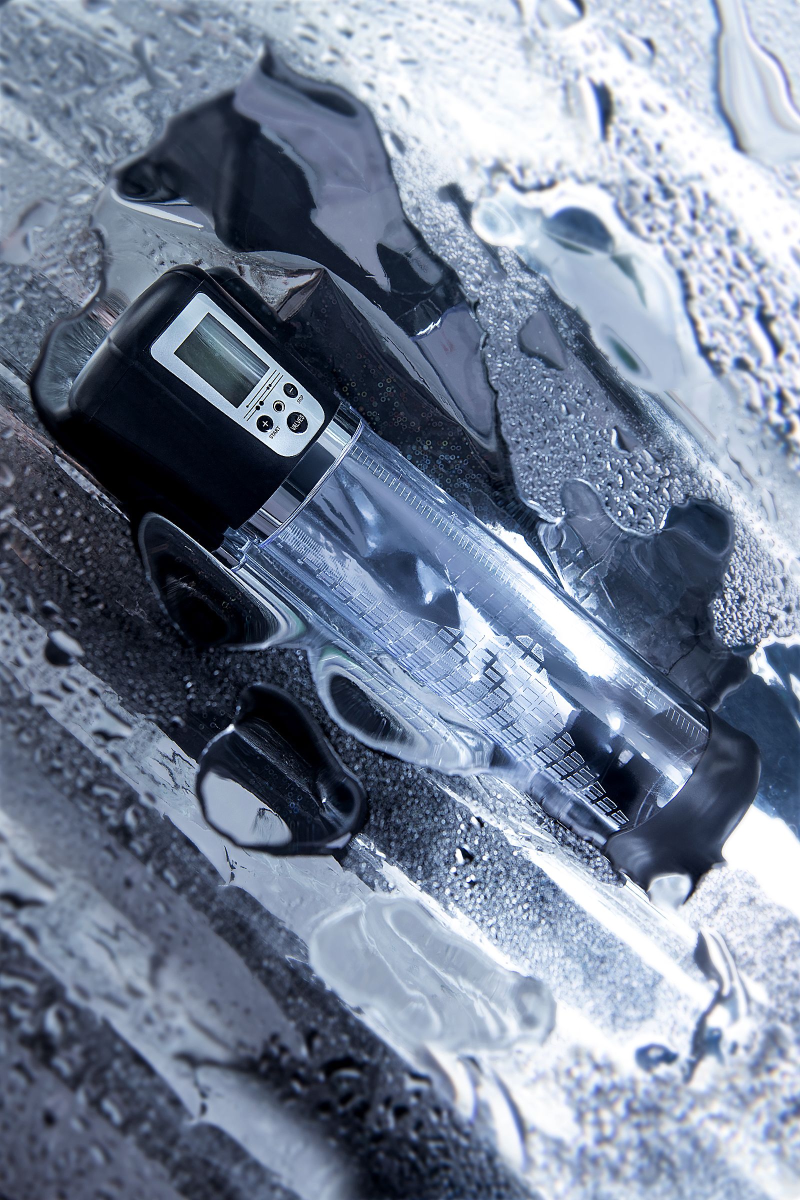 Помпа имеет 4 уровня давления, которые регулируются кнопками +/ - на колбе, сброс давления – кнопкой Valves. На LCD экране помпы Alrik можно видеть время помпирования, давление и уровень, на котором в данный момент работает умное устройство. После сброса давления помпа сама откачает воздух до заданного режима.