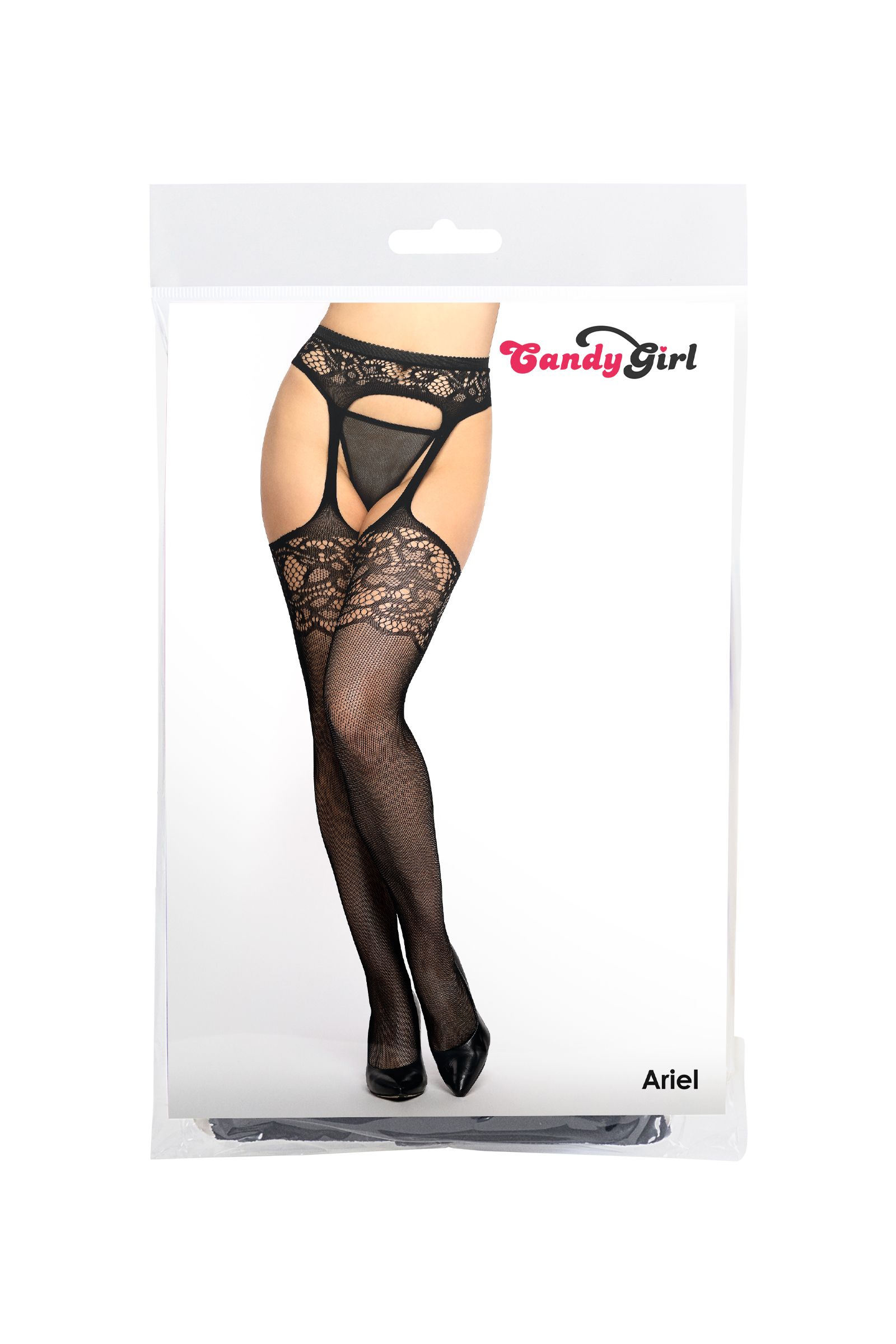 Чулки с поясом и стринги Candy Girl® Ariel выполнены из сетки равномерного плетения с ажурными вставками. Эластичные чулки подчеркивают стройность, а пажи и пояс с высокой посадкой зрительно удлиняют ноги и акцентируют внимание на ягодицах. Кружевные пояс и резинки чулок превращают классические чулки из сетки в роскошный аксессуар. Усиленные носочки дарят комфорт при использовании. Носить чулки можно как со стрингами, так и без.