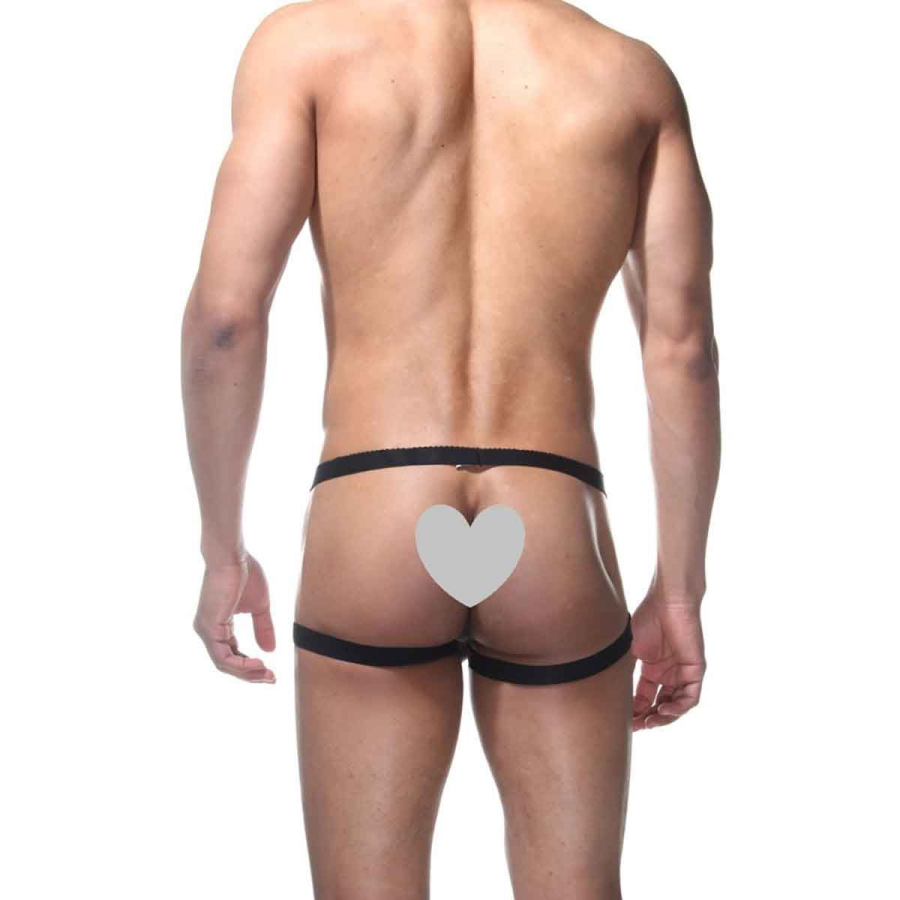Трусы мужские из черного гладкого материала, с полностью открытыми ягодицами и черными резинками на бедрах.