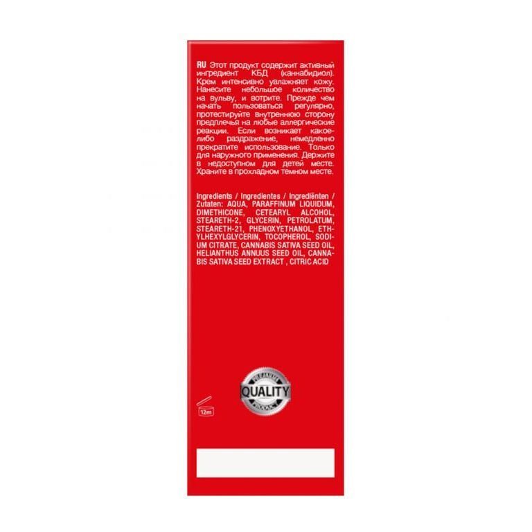 Вода, вазелиновое масло, диметикон, цетеариловый спирт, стеарет-2, глицерин, вазелин, стеарет-21, феноксиэтанол, этилгексилглицерин, токоферол, цитрат натрия, масло семян каннабиса посевного, масло семян подсолнечника однолетнего, экстракт семян каннабиса посевного, лимонная кислота.