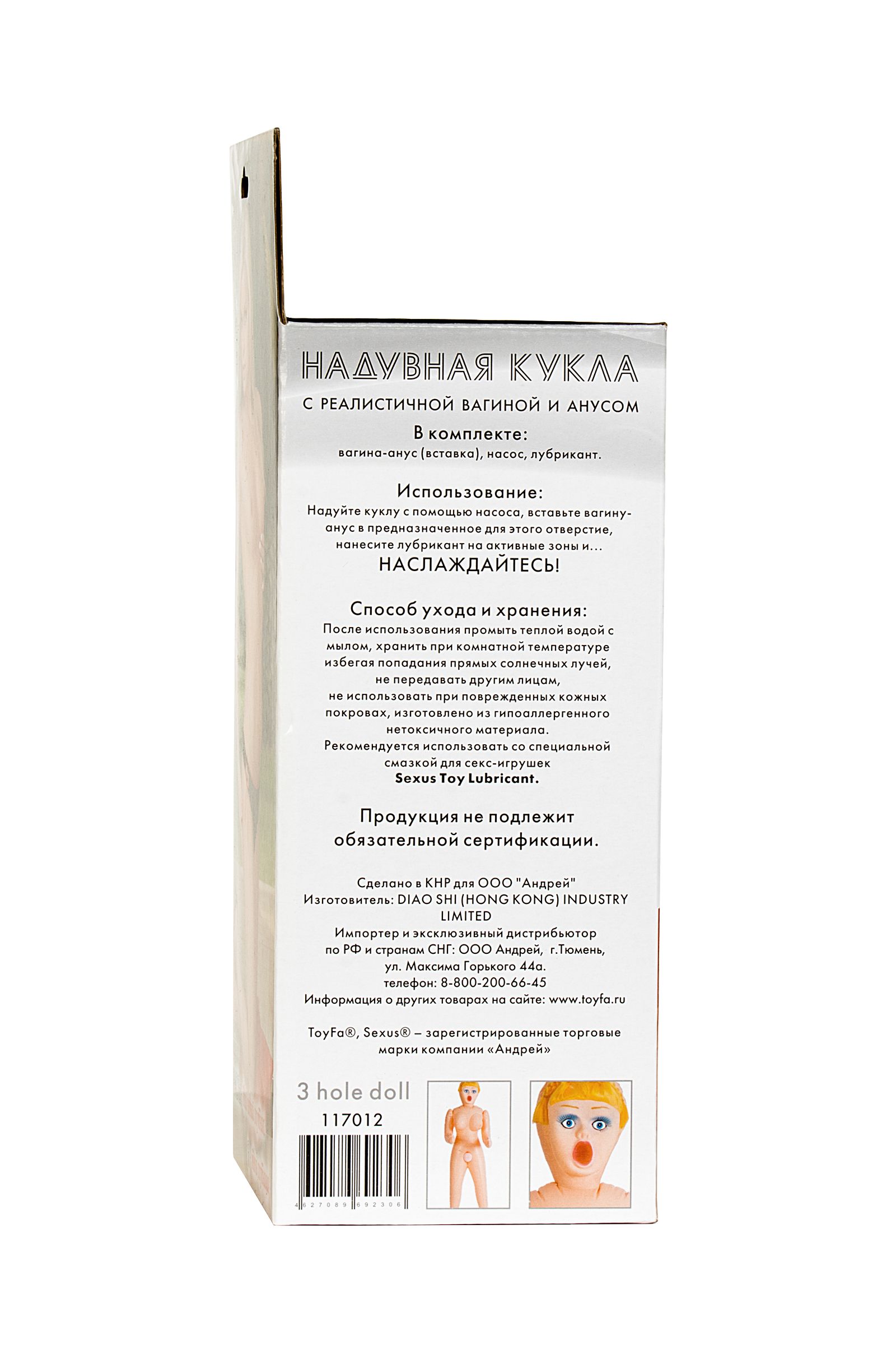 Эта надувная кукла с приоткрытым ротиком обладает соблазнительными отверстиями, выполненными из киберкожи. Такие анус и вагина практически ничем не отличаются от настоящих: они нежные и очень приятные на ощупь. А главное — они всегда готовы принять разгорячённую плоть! Остаётся лишь решить, кто будет ублажать сегодня — надувная блондинка, брюнетка, шатенка или рыжая, а, может быть, все сразу! Рост 160 см.