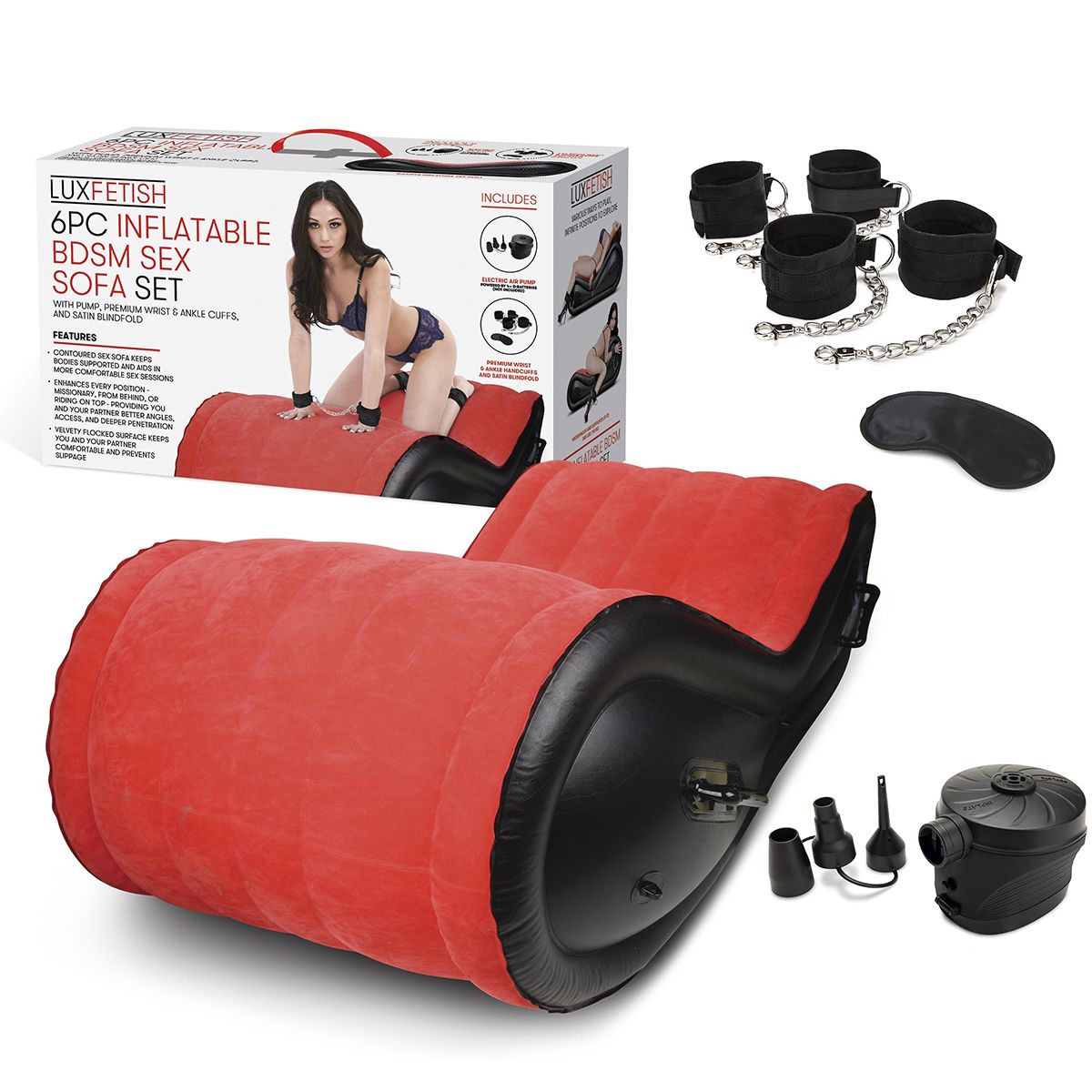 Надувная секс-софа для БДСМ-игр из 6 предметов включает в себя все, что вам нужно, чтобы улучшить сексуальную парную игру с элементами бондажа. А также это просто универсальный предмет мебели, который позволит вам попробовать секс в новых захватывающих позах. Эта надувная кровать, выполненная в классической эротической цветовой комбинации красного и черного, она манит вас своей бархатистой мягкой поверхностью и своими чувственными изгибами, изготовлена из прочного ПВХ и покрыта бархатистым материалом для комфорта. Получите удовольствие от экспериментов с прилагаемыми манжетами для запястий и щиколоток. Простые в использовании манжеты удобны для новичков и являются идеальным введением в мир БДСМ-игр. С комфортом передайте контроль за ситуацией. Лежа и расслабляясь, позволяйте своему доминирующему партнеру взять на себя все управление сексуальной игрой, пока вы подчиняетесь его стимулирующим прикосновениям. Софу можно надуть в любой момент, когда наступит сексуальное настроение, а также можно сдуть, когда игра закончится. Помимо фиксаторов для запястий и щиколоток в комплекте к софе предлагается черная маска и насос, работающий от четырех батареек типа D (не входят в комплект).