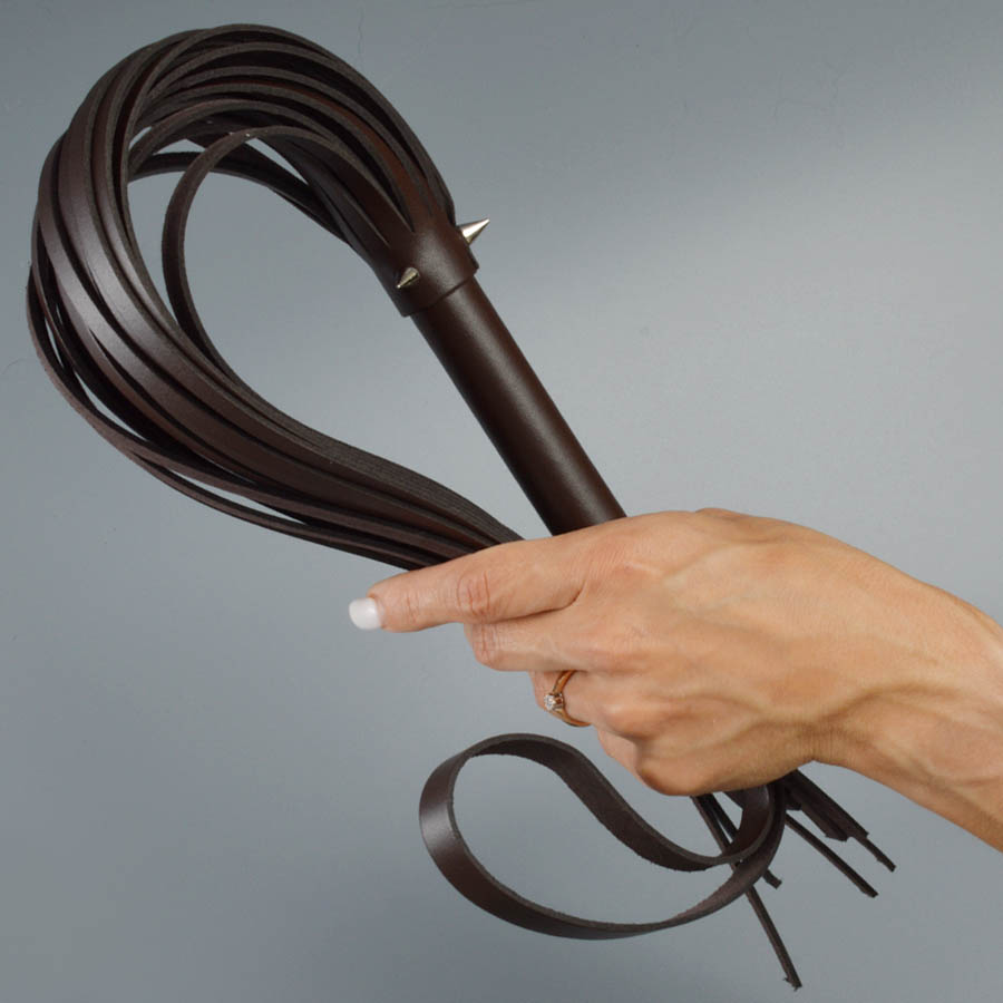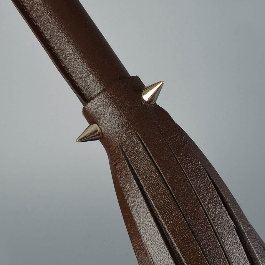 Плеть изготовлена из натуральной кожи коричневого цвета и украшена тремя металлическими  шипами.  Общая длина плети 55см.