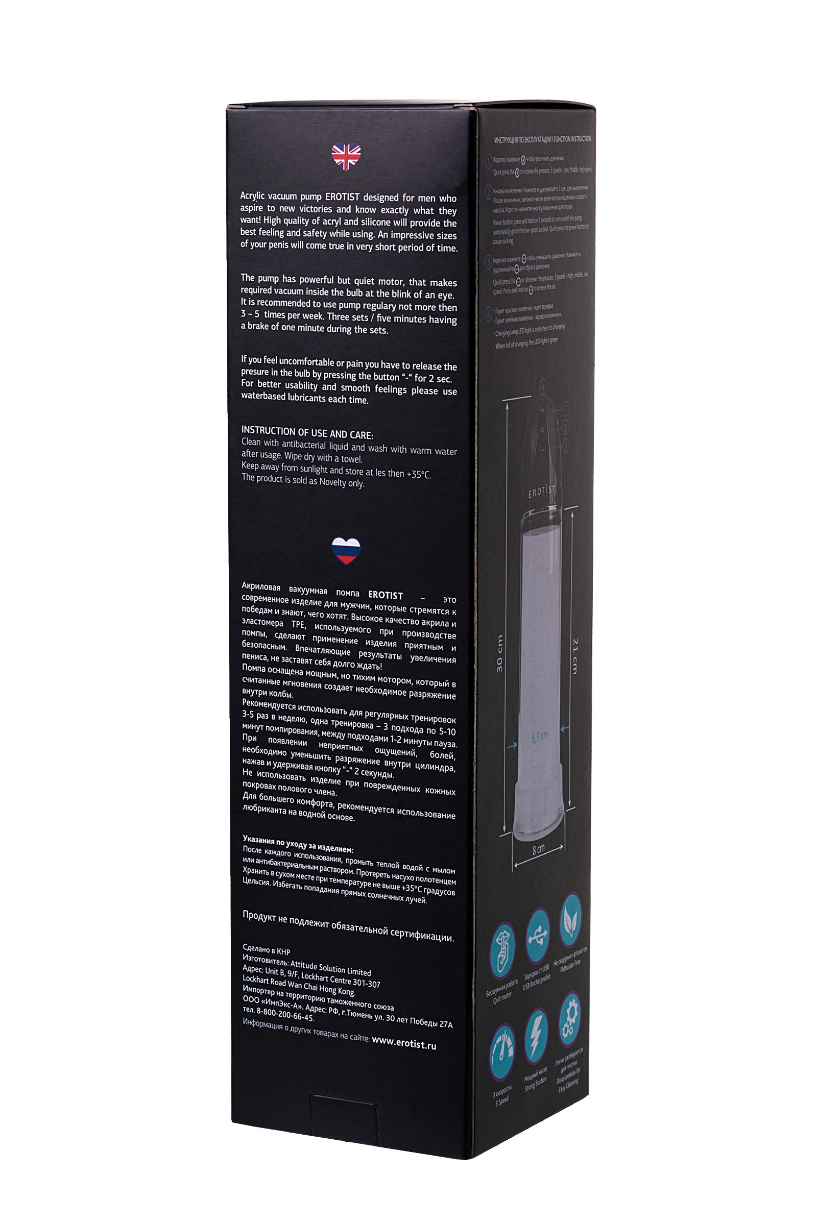 Массажер для мужчин, которые стремятся к победам Помпа повышает качество эрекции и стабилизирует потенцию, улучшает кровообращение, тонус сосудов и эластичность тканей пениса. При регулярных тренировках увеличивает размер полового члена. Кратковременный результат заметен после первого применения. Помпа оснащена мощным электрическим насосом, который в считанные мгновения создает внутри колбы разрежение, оптимальное для тренировки. Бесшумная работа мотора не отвлекает от процесса тренировки. Мощный насос увеличивает результативность занятий. 3 скорости откачки воздуха позволяют выбрать наиболее комфортный режим. Высокое качество акрила и эластомера делает применение изделия приятным и безопасным. Зарядка от USB помогает всегда оставаться в строю. Отсутствие сложных элементов позволяет легко разбирать помпу для чистки.
