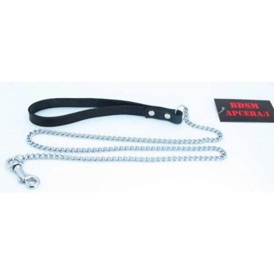 Поводок изготовлен из натуральной кожи. При изготовлении использована фурнитура с никелевым покрытием. Металлическая цепочка (поводок), с карабином на конце, поможет вам с лёгкостью управлять своим партнёром. Длина цепочки - 90 см., ширина - 0,8 см