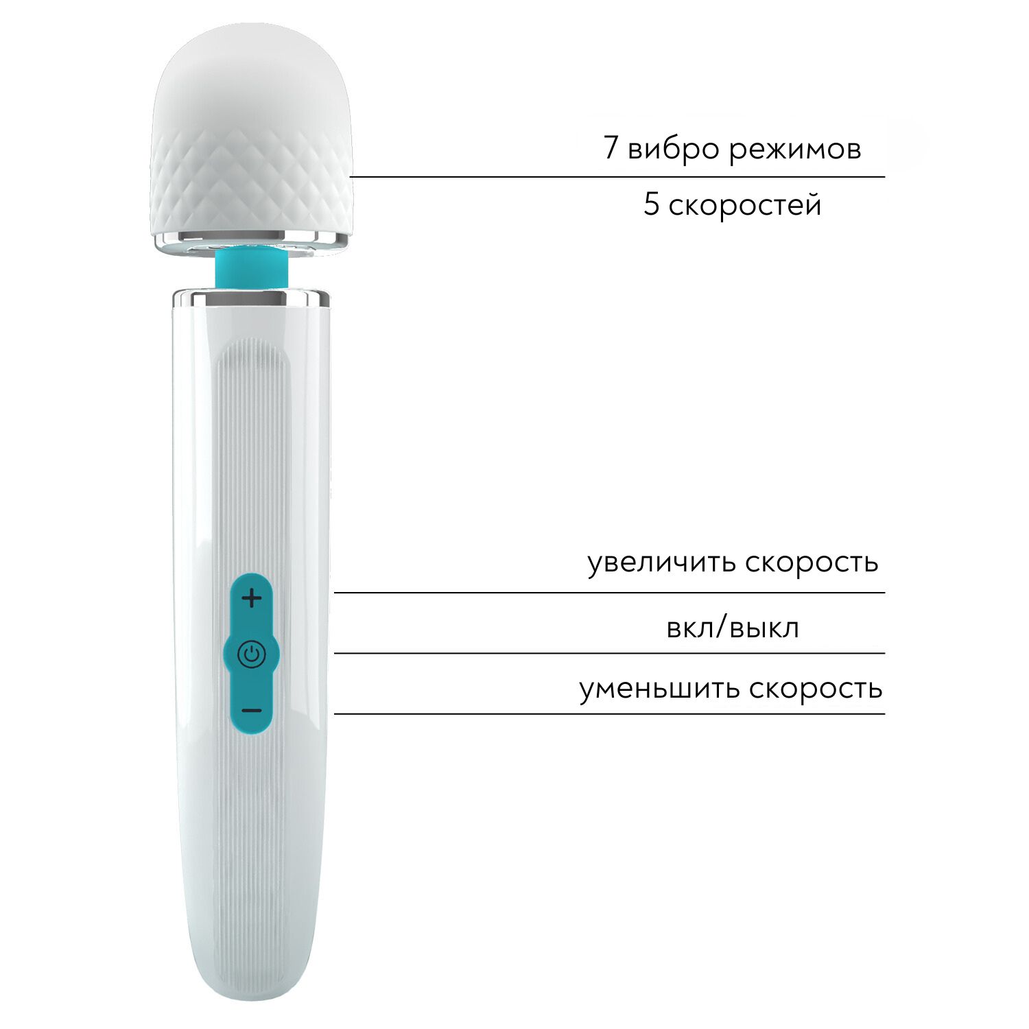 Этот очаровательный массажер оснащен сверхмощным мотором для интенсивных вибраций. С его округлой головкой, массажер можно использовать для самых разных целей. Этот  массажер имеет 5 уровней скорости и 7 режимов вибрации, которые легко управляются с помощью кнопок на ручке. Подарите себе мощные вибрации!